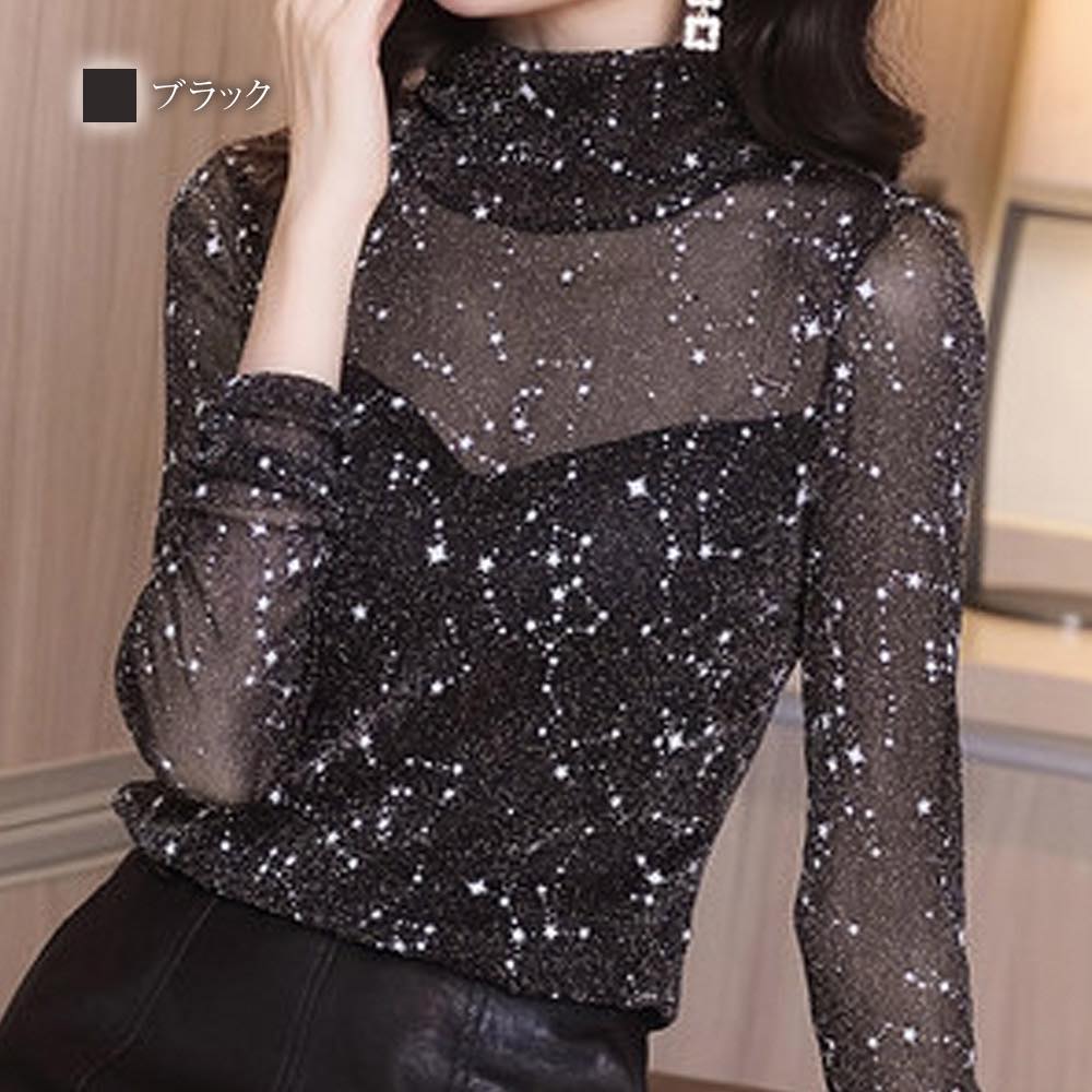 【商品名】ハイネックラメトップス【カラー】ブラック【サイズ】S M L XL 2XL【サイズ表記】・Sサイズ:着丈53 身幅80 肩幅37 袖丈50・Mサイズ:着丈54 身幅84 肩幅38 袖丈51・Lサイズ:着丈55 身幅88 肩幅39 袖丈52・XLサイズ:着丈56 身幅92 肩幅40 袖丈53・2XLサイズ:着丈57 身幅96 肩幅41 袖丈54【素材】ポリエステル90%ポリウレタン10%【重量】【季節】【スタッフコメント】星空のようにラメが輝くハイネックトップス。